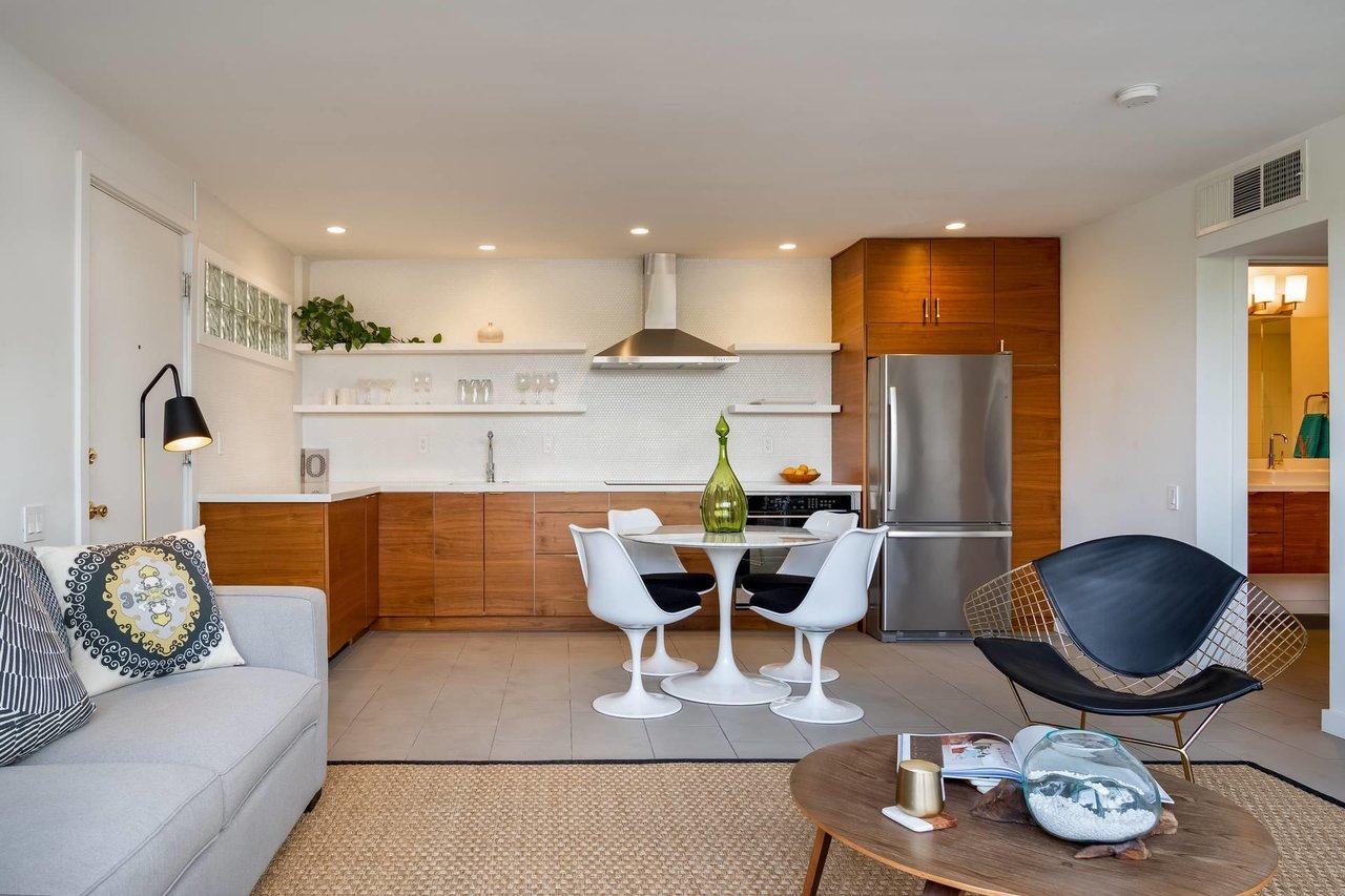 Charm, History and Style.... These words come alive as you arrive at the Ocotillo Lodge in South Palm Springs! Designed by famous architect, William Krisel, this tastefully remodeled, ground level unit is conveniently located near the main entry of this iconic architectural gem. Fantastic restaurants, cafes and boutique hotels are an easy stroll away and if you plan to stay put.. enjoy the huge champagne bottle shaped pool while taking in the majestic view of Mt San Jacinto. No fear of high Air Conditioning bills here....The HOA includes trash, water, cable AND electric and there are no restrictions on short term rentals making this a valuable and viable income earning property. The uniquely larger patio runs the full length of the home and has a private gate making for convenient loading and unloading. Completely remodeled & updated with new walnut cabinets, porcelain floor tile that carries through to the patio, penny-round back splash, insulated noise proof ceiling, in-house washer/dryer and a glass Euro-shower enclosure...this is ready to go! The updated appliances pair well with quartz counters and brass Restoration Hardware pulls in the open concept kitchen, and the bathroom, with it's clean, stylish lines continues the timeless elegance of this wonderful property. No expense was spared to ensure a current, modern aesthetic and exquisite design. A place to call home or a home to call a getaway.