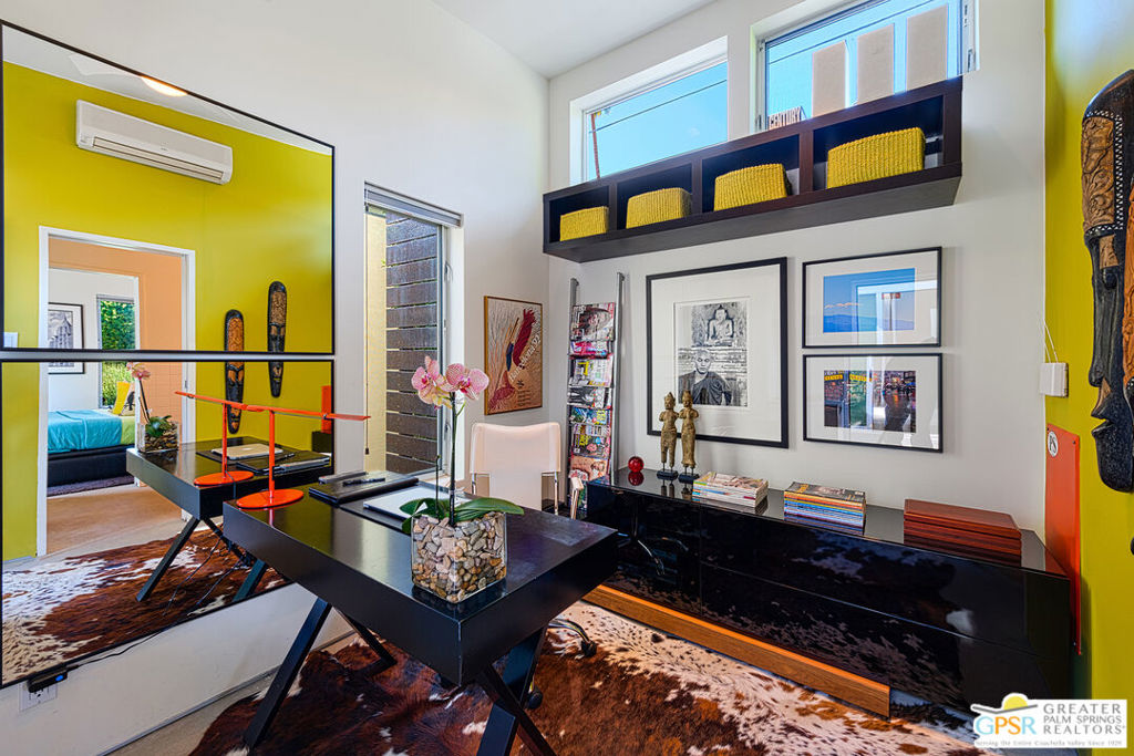 AVAILABLE March 16, 2026 to Dec 31, 2026, and starting April 1, 2027. Seasonal Rental. This unique Palm Springs modem compound is in the popular Twin Palms Estates neighborhood. The walled and gated property features multiple structures and outdoor spaces, resort-style amenities, and architectural design reminiscent of the iconic Alexander butterfly mid-century modern homes. This Palm Springs home truly speaks to the Art of Desert Living, has been cited and featured in a variety of magazines worldwide and won Home of The Year in Metropolitan Home. The art of desert living is best exemplified in a property's outdoor amenities, and this property doesn't disappoint. Amenities include a 60 ft saltwater pool, large saltwater spa, outdoor kitchen, outdoor bed, 4 fire-pits, 2 outdoor showers and more. There is about 2,000 sqft of interior space spread out over 3 buildings. The main house consists of a living room, dining room and kitchen. All rooms have concrete floors and large sliding glass doors, that when opened, blur the line between indoor and outdoor spaces. The living room features a wall mounted TV plus a large seating area with L-shaped sofa, ottoman and 2 comfortable chairs. A large sliding glass door connects the living room to an outdoor bed with pool and mountain view. Next to the Dining room is the kitchen. The two rooms are separated by a breakfast bar with a built-in fireplace. The kitchen itself has a modem and commercial vibe and features high quality appliances including large stove top with grill, oven, wine refrigerator, refrigerator freezer and dishwasher. The adjacent dining room seats six and has two over-sized sliding glass doors. One of the doors opens to a wood bridge that spans the pool to secondary ensuite bedroom and the other door opens to an outdoor dining room, distinctive firepit seating area and a detached structure solely for the primary bedroom and bathroom. The Primary Bedroom is a stand-alone structure just steps away from the main house. Like the main house it has concrete floors and a large sliding glass door, that when opened, blur the line between your bedroom and the outside. Inside you'll find a King size bed, spacious closet, Smart TV and gas fireplace that separate the bedroom from the master bathroom. On the bathroom side, the fireplace is perfectly situated next to the large bathtub. Who needs candles when you can soak beside the flames of a roaring fireplace? There is also a large shower with waterfall shower head, two large sinks, a clerestory window and a door that opens to a private outdoor shower. The Guest bedroom/den structure features a guest bedroom with queen size bed and Smart TV. A bathroom connects it to the guest living room that features a couch that can sleep one, and another Smart TV. The main purpose of this Palm Springs modern compound is "rest, rejuvenation, and fun". Flanking the 60 ft saltwater pool, lounge chairs and large outdoor bed float above the water while the outdoor kitchen with gas grill, refrigerator and bar seating area anchor to the additional yard amenities. Next to the outdoor kitchen is a bubbling saltwater spa which is just steps away from an additional outdoor bed perfect for lounging. At the other end of the pool is the Pool House that provides an outdoor shower, cabana room and washer/dryer. On the other side of the compound is a distinctive seating area where guests can sit or lie on huge boulders encircling a recessed fire pit that shoots flames right out of the ground. This desert modern home is distinctive and award-winning; providing an elemental experience that includes earth, fire and water with a generous serving of Palm Springs architecture, upscale amenities and conveniences, and a chic urban vibe.