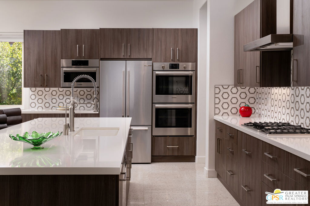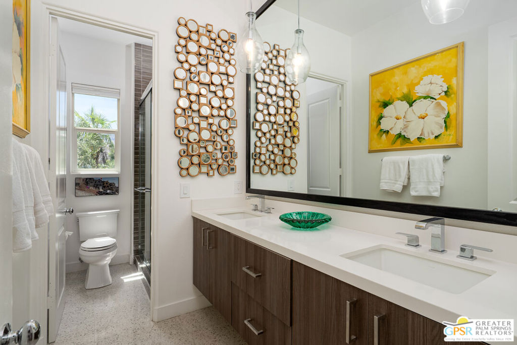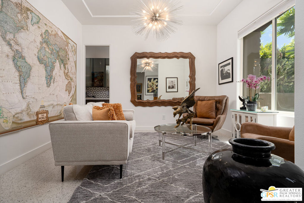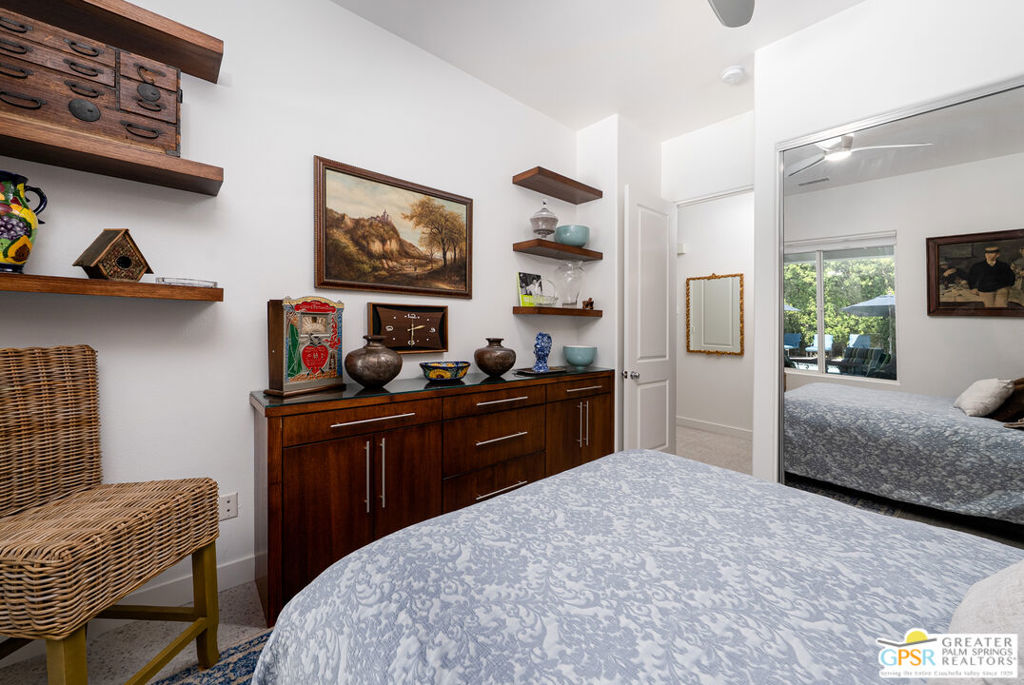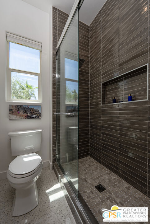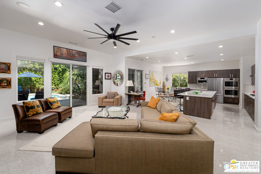 Enormous beautifully renovated 3 bedroom home with separate 1 bed/1 bath GUEST HOUSE in Palm Springs. The Guest House features a separate private walkway, gate and entrance as well as a full kitchen and washer/dryer. Built in 2004, this home has been lovingly maintained and upgraded. The large terrazzo tile flooring extends throughout the entire home. The spacious open floor plan brings the kitchen, living room and dining room together for inclusion for all. This home is spacious and boasts an open kitchen that flows into the great room, which is anchored by a fireplace and tempting views of the private pool/spa area. The large gourmet cook's kitchen includes an large central island with counter seating, Butler's pantry/coffee station, dry goods pantry, Bosch appliances, gas cooktop and modern tile backsplash. The primary suite is EXPANSIVE with a full office/private living room/media room attached at the back. With a small change, this room could even be a 5th bedroom or 2nd casita as it has it's own private entrance. The primary bath includes a stand alone tub, large shower, dual sink floating vanity, appropriately sized expansive mirror, separate water closet and walk-in closet with custom shelving. Two guest suites share the guest bath also with stunning dual sink vanity and matching impressive custom mirror. Views of the pool and spa can be seen from almost every room through dual pane windows and sliding doors. Energy efficiency was well considered with multiple AC zones, enhanced ceiling fans and 42 solar panels. Parking includes an oversized 2-car garage and a driveway with room for 3 cars. Other amenities include water conditioner system, outdoor shower, tankless water heater and a separate laundry room with upper and lower cabinets, sink, counter space and window with a mountain view. THE CASITA has a separate PRIVATE walkway and entrance. Inside, a bedroom, living room, stackable laundry, desk/dining table, kitchen with cabinets, counters, refrigerator, sink and disposal, gas range, oven and microwave. The casita furnishings are included, save a few items. The owners have rented this casita out casually making about $20,000 per year income. Alternatively, live and use the casita while renting out the main house for even greater income. In the back yard, the pool and spa with waterfall takes the main focus. Don't miss the hardline gas grill, outdoor shower, pet friendly grass areas and entertainment area for outdoor table tennis and games. The versatility of the homes features will make you feel at home immediately upon arrival. On land that you own. No HOA. Solar system includes 42 panels w 13.73kW.