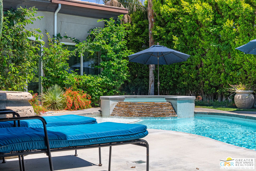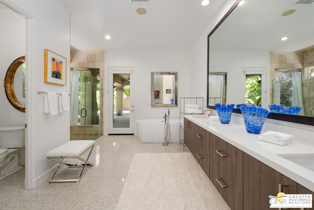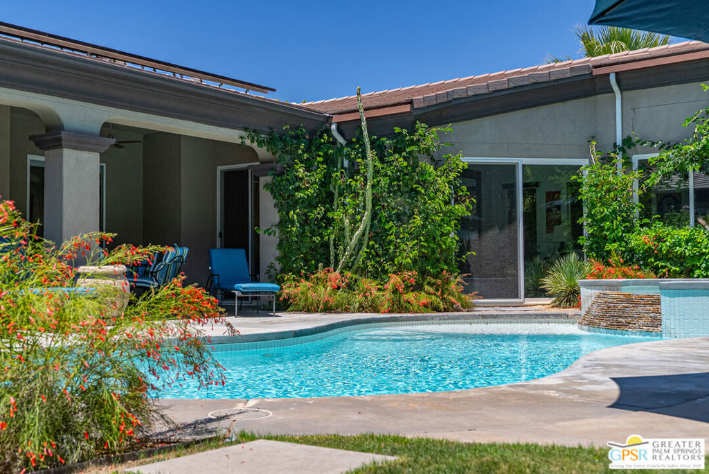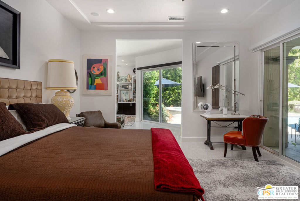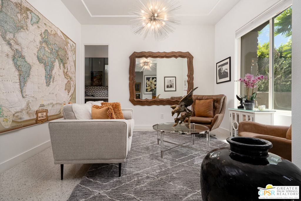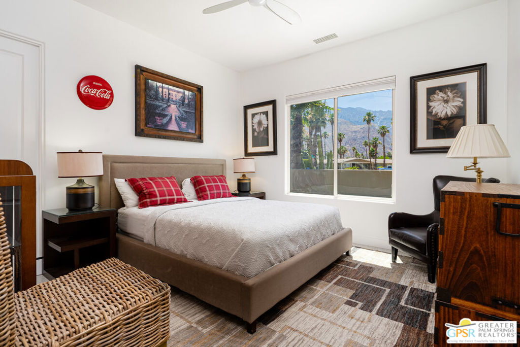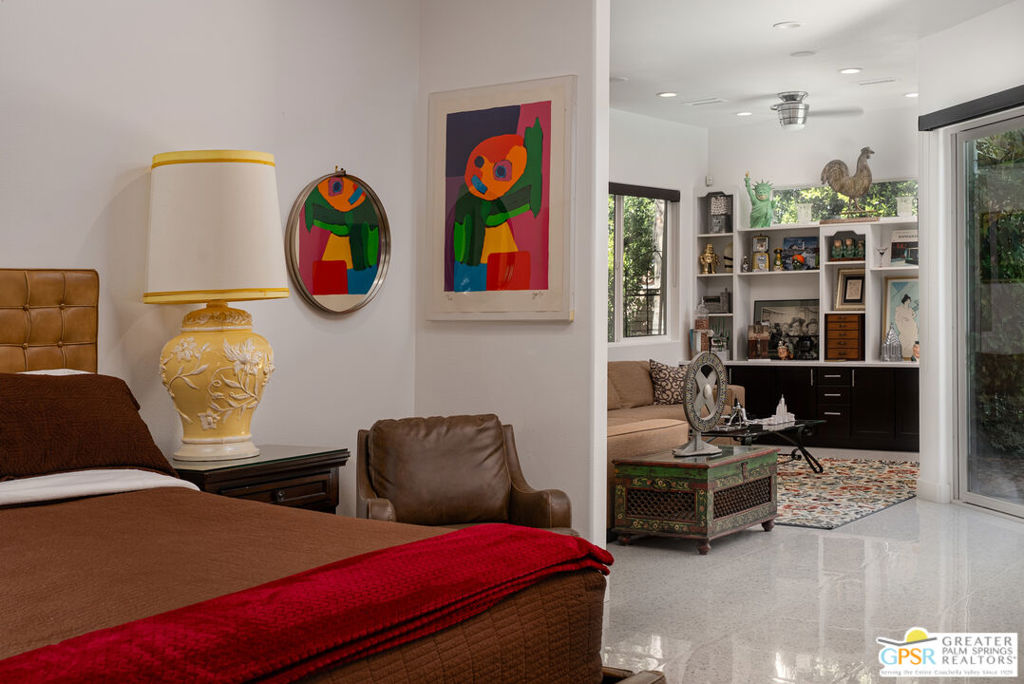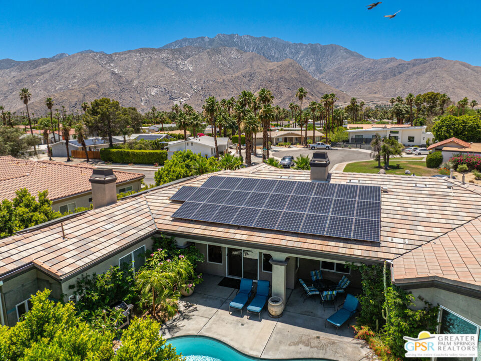 REDUCED $50,0000 AND Solar Lease PAID IN FULL. Enormous beautifully renovated 3 bedroom home with separate 1 bed/1 bath GUEST HOUSE in Palm Springs. The Guest House features a separate private walkway, gate and entrance as well as a full kitchen and washer/dryer. Built in 2004, this home has been lovingly maintained and upgraded. The large terrazzo tile flooring extends throughout the entire home. The spacious open floor plan brings the kitchen, living room and dining room together for inclusion for all. This home is spacious and boasts an open kitchen that flows into the great room, which is anchored by a fireplace and tempting views of the private pool/spa area. The large gourmet cook's kitchen includes an large central island with counter seating, Butler's pantry/coffee station, dry goods pantry, Bosch appliances, gas cooktop and modern tile backsplash. The primary suite is EXPANSIVE with a full office/private living room/media room attached at the back. With a small change, this room could even be a 5th bedroom or 2nd casita as it has its own private entrance. The primary bath includes a stand alone tub, large shower, dual sink floating vanity, appropriately sized expansive mirror, separate water closet and walk-in closet with custom shelving. Two guest suites share the guest bath also with stunning dual sink vanity and matching impressive custom mirror. Views of the pool and spa can be seen from almost every room through dual pane windows and sliding doors. Energy efficiency was well considered with multiple AC zones, enhanced ceiling fans and 42 solar panels. Parking includes an oversized 2-car garage and a driveway with room for 3 cars. Other amenities include water conditioner system, outdoor shower, tankless water heater and a separate laundry room with upper and lower cabinets, sink, counter space and window with a mountain view. THE CASITA has a separate PRIVATE walkway and entrance. Inside, a bedroom, living room, stackable laundry, desk/dining table, kitchen with cabinets, counters, refrigerator, sink and disposal, gas range, oven and microwave. The owners have rented this casita out casually making about $20,000 per year income. Alternatively, live and use the casita while renting out the main house for even greater income. In the back yard, the pool and spa with waterfall takes the main focus. Don't miss the hardline gas grill, outdoor shower, pet friendly grass areas and entertainment area for outdoor table tennis and games. The versatility of the homes features will make you feel at home immediately upon arrival. On land that you own. No HOA. Solar system includes 42 panels w 13.73kW.