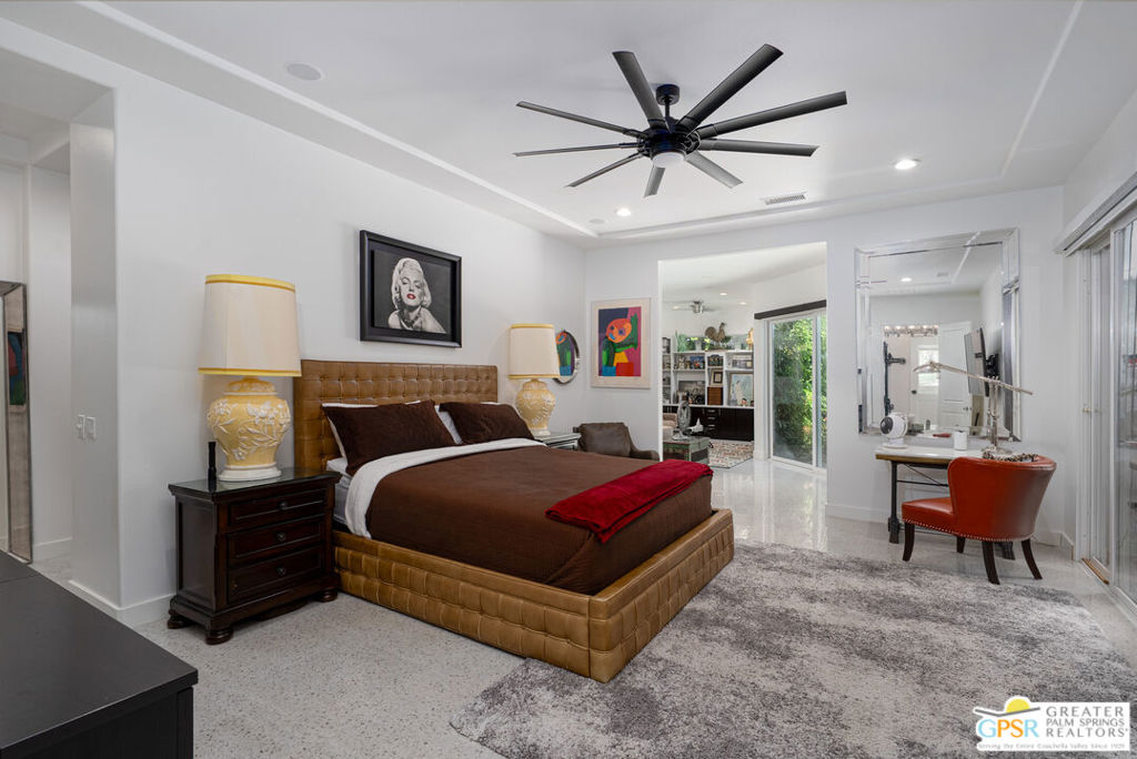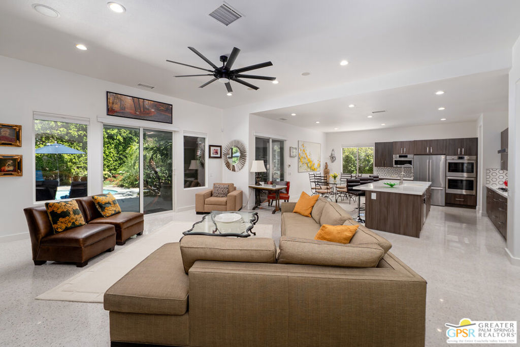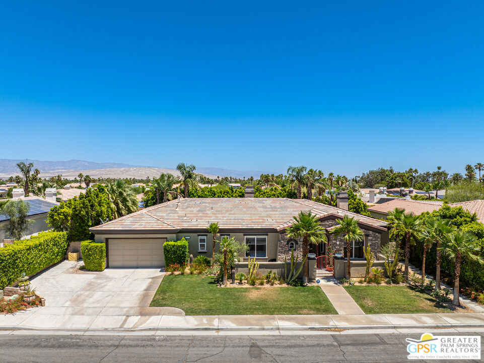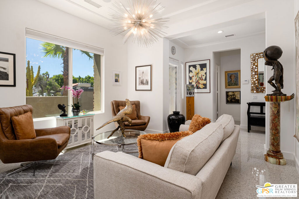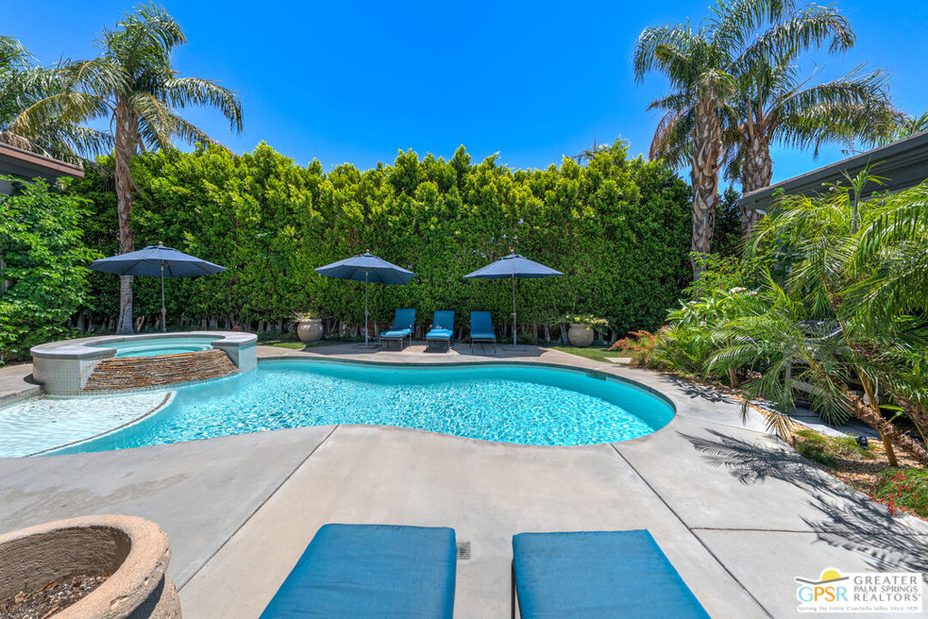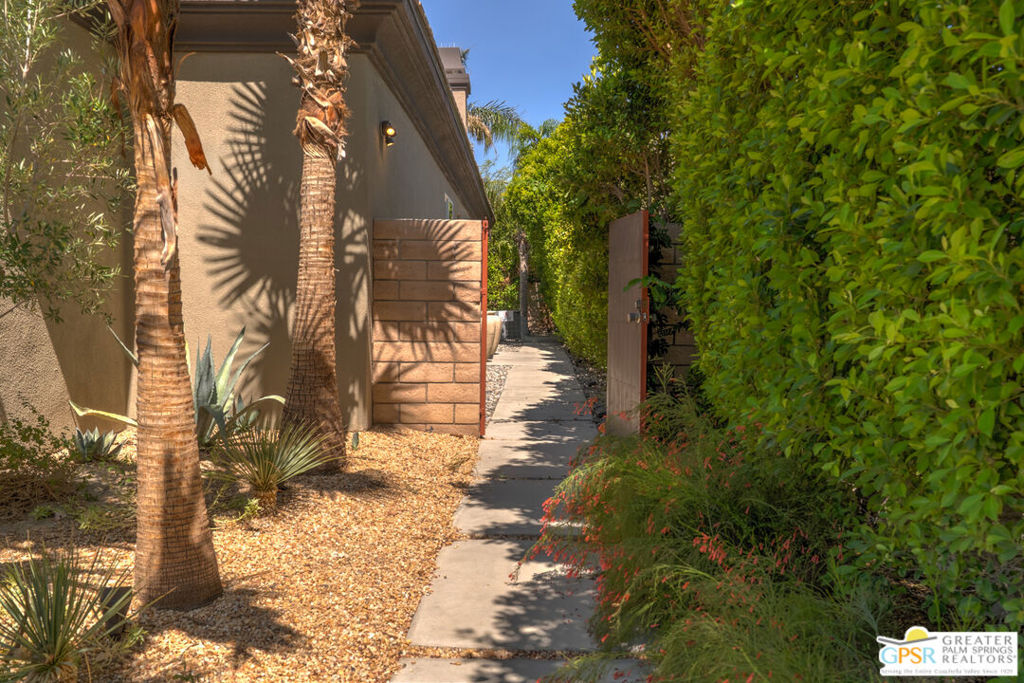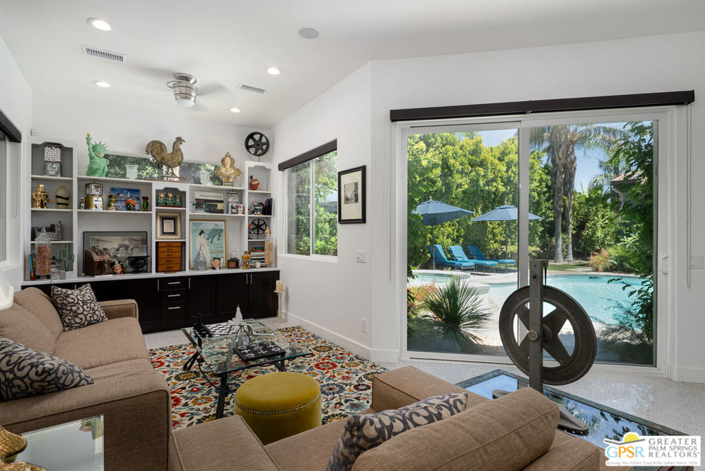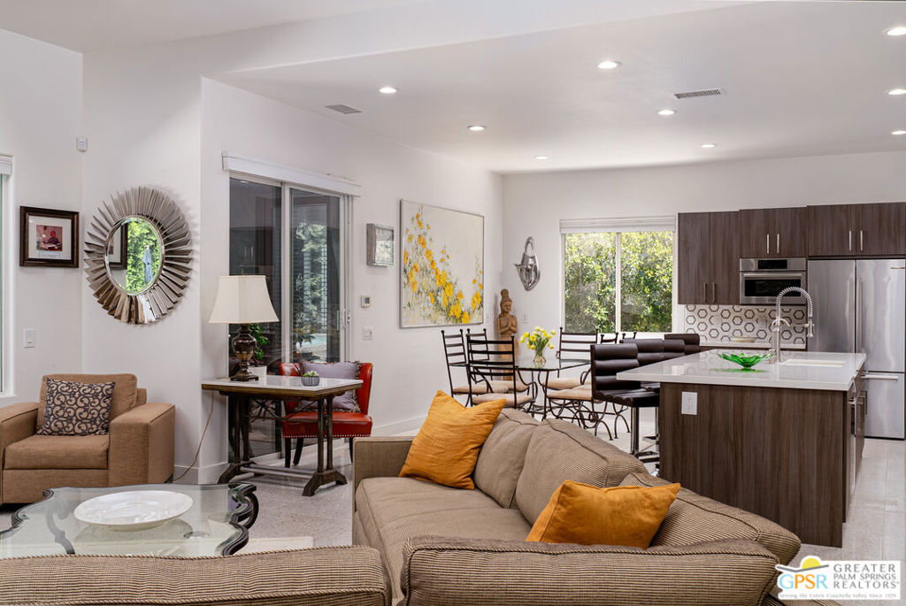 REDUCED $50,0000 AND Solar Lease PAID IN FULL. Enormous beautifully renovated 3 bedroom home with separate 1 bed/1 bath GUEST HOUSE in Palm Springs. The Guest House features a separate private walkway, gate and entrance as well as a full kitchen and washer/dryer. Built in 2004, this home has been lovingly maintained and upgraded. The large terrazzo tile flooring extends throughout the entire home. The spacious open floor plan brings the kitchen, living room and dining room together for inclusion for all. This home is spacious and boasts an open kitchen that flows into the great room, which is anchored by a fireplace and tempting views of the private pool/spa area. The large gourmet cook's kitchen includes an large central island with counter seating, Butler's pantry/coffee station, dry goods pantry, Bosch appliances, gas cooktop and modern tile backsplash. The primary suite is EXPANSIVE with a full office/private living room/media room attached at the back. With a small change, this room could even be a 5th bedroom or 2nd casita as it has its own private entrance. The primary bath includes a stand alone tub, large shower, dual sink floating vanity, appropriately sized expansive mirror, separate water closet and walk-in closet with custom shelving. Two guest suites share the guest bath also with stunning dual sink vanity and matching impressive custom mirror. Views of the pool and spa can be seen from almost every room through dual pane windows and sliding doors. Energy efficiency was well considered with multiple AC zones, enhanced ceiling fans and 42 solar panels. Parking includes an oversized 2-car garage and a driveway with room for 3 cars. Other amenities include water conditioner system, outdoor shower, tankless water heater and a separate laundry room with upper and lower cabinets, sink, counter space and window with a mountain view. THE CASITA has a separate PRIVATE walkway and entrance. Inside, a bedroom, living room, stackable laundry, desk/dining table, kitchen with cabinets, counters, refrigerator, sink and disposal, gas range, oven and microwave. The owners have rented this casita out casually making about $20,000 per year income. Alternatively, live and use the casita while renting out the main house for even greater income. In the back yard, the pool and spa with waterfall takes the main focus. Don't miss the hardline gas grill, outdoor shower, pet friendly grass areas and entertainment area for outdoor table tennis and games. The versatility of the homes features will make you feel at home immediately upon arrival. On land that you own. No HOA. Solar system includes 42 panels w 13.73kW.