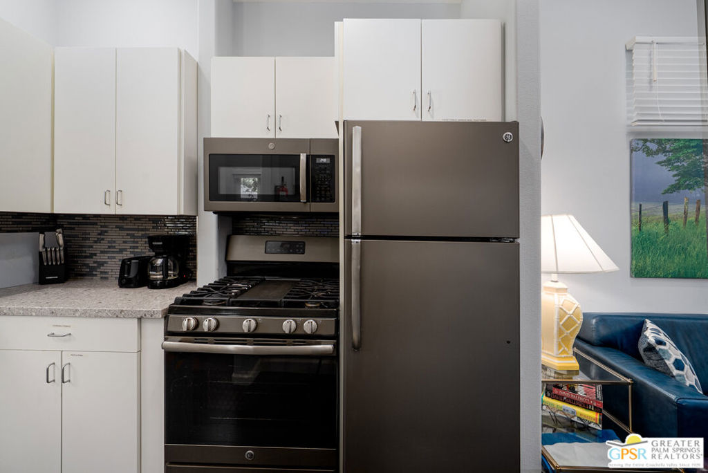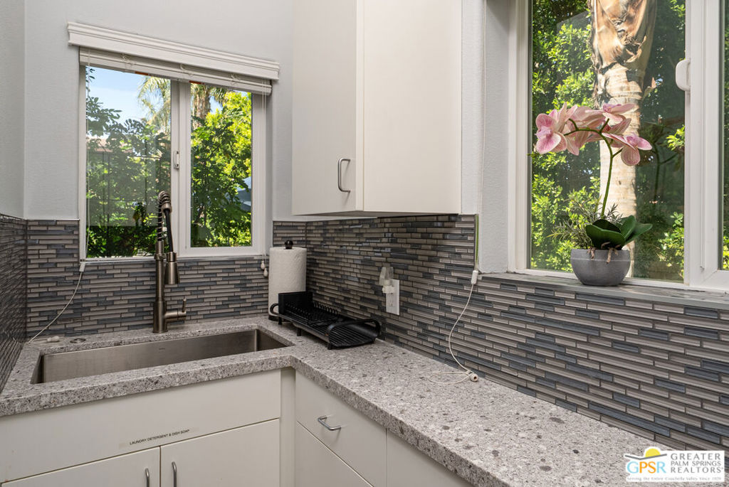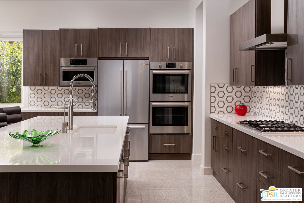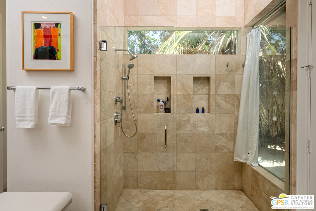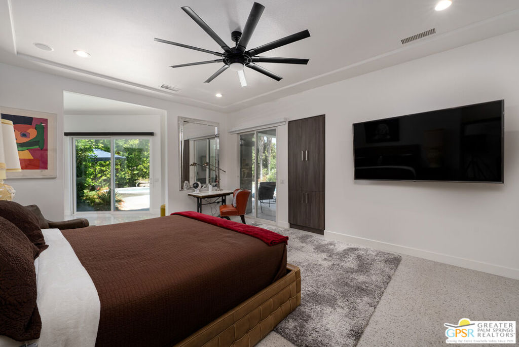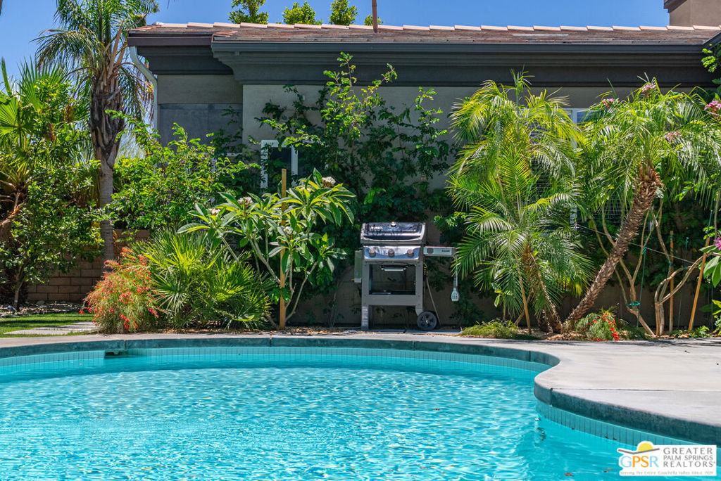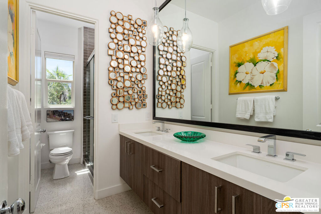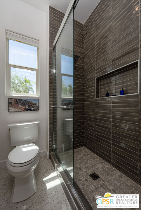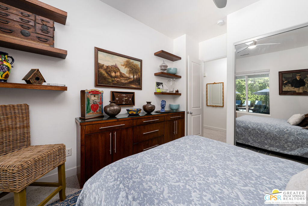 REDUCED $50,0000 AND Solar Lease PAID IN FULL. Enormous beautifully renovated 3 bedroom home with separate 1 bed/1 bath GUEST HOUSE in Palm Springs. The Guest House features a separate private walkway, gate and entrance as well as a full kitchen and washer/dryer. Built in 2004, this home has been lovingly maintained and upgraded. The large terrazzo tile flooring extends throughout the entire home. The spacious open floor plan brings the kitchen, living room and dining room together for inclusion for all. This home is spacious and boasts an open kitchen that flows into the great room, which is anchored by a fireplace and tempting views of the private pool/spa area. The large gourmet cook's kitchen includes an large central island with counter seating, Butler's pantry/coffee station, dry goods pantry, Bosch appliances, gas cooktop and modern tile backsplash. The primary suite is EXPANSIVE with a full office/private living room/media room attached at the back. With a small change, this room could even be a 5th bedroom or 2nd casita as it has its own private entrance. The primary bath includes a stand alone tub, large shower, dual sink floating vanity, appropriately sized expansive mirror, separate water closet and walk-in closet with custom shelving. Two guest suites share the guest bath also with stunning dual sink vanity and matching impressive custom mirror. Views of the pool and spa can be seen from almost every room through dual pane windows and sliding doors. Energy efficiency was well considered with multiple AC zones, enhanced ceiling fans and 42 solar panels. Parking includes an oversized 2-car garage and a driveway with room for 3 cars. Other amenities include water conditioner system, outdoor shower, tankless water heater and a separate laundry room with upper and lower cabinets, sink, counter space and window with a mountain view. THE CASITA has a separate PRIVATE walkway and entrance. Inside, a bedroom, living room, stackable laundry, desk/dining table, kitchen with cabinets, counters, refrigerator, sink and disposal, gas range, oven and microwave. The owners have rented this casita out casually making about $20,000 per year income. Alternatively, live and use the casita while renting out the main house for even greater income. In the back yard, the pool and spa with waterfall takes the main focus. Don't miss the hardline gas grill, outdoor shower, pet friendly grass areas and entertainment area for outdoor table tennis and games. The versatility of the homes features will make you feel at home immediately upon arrival. On land that you own. No HOA. Solar system includes 42 panels w 13.73kW.