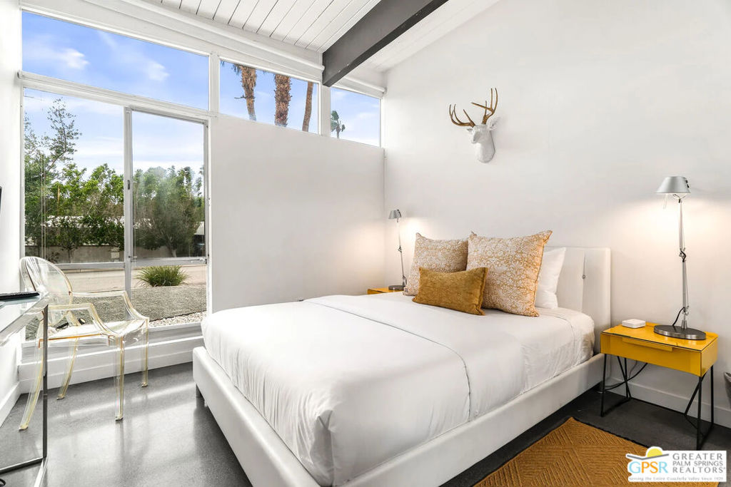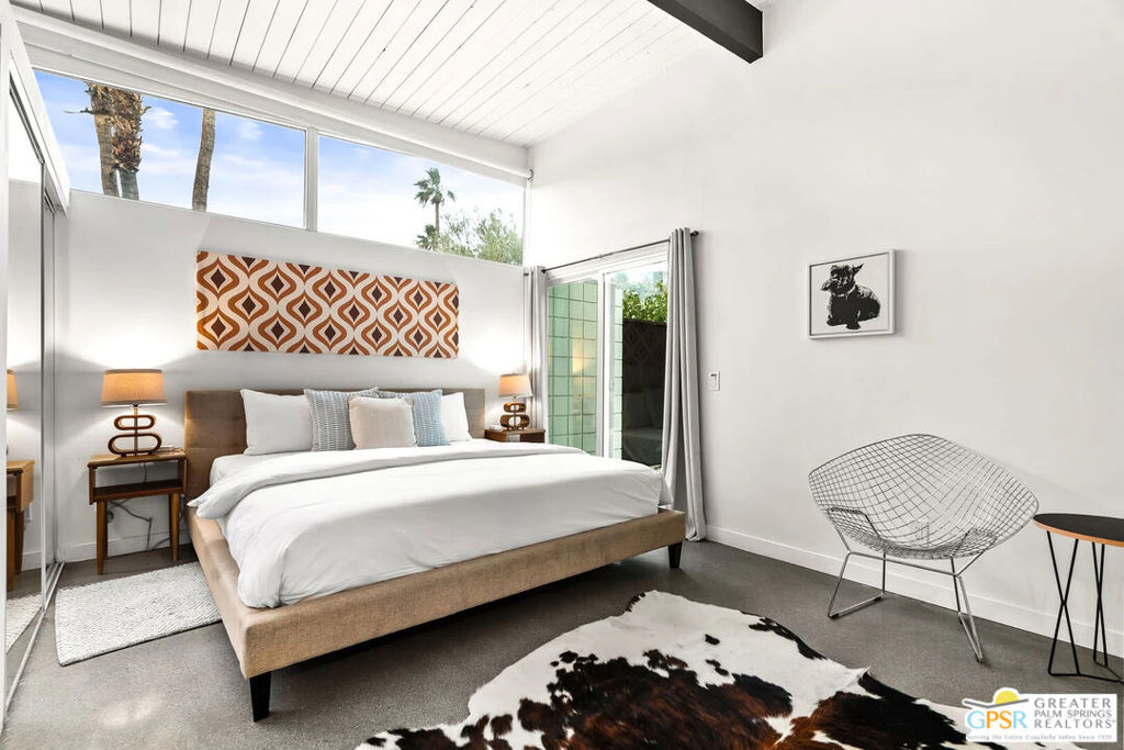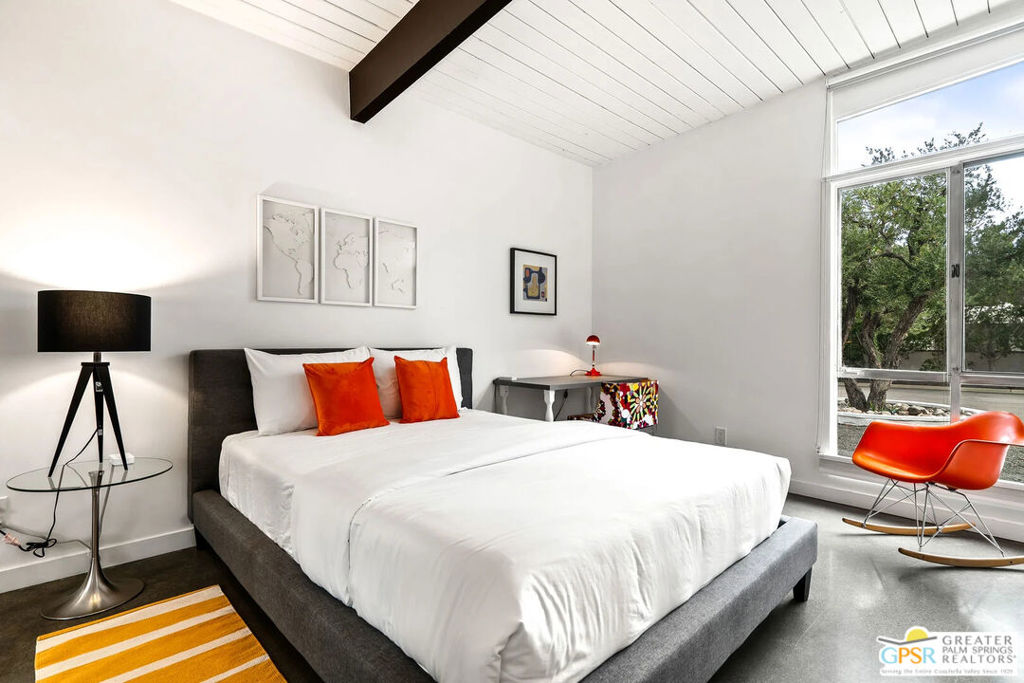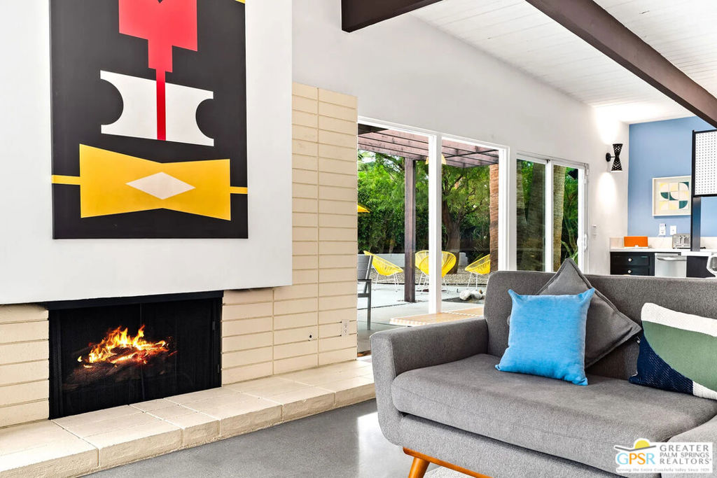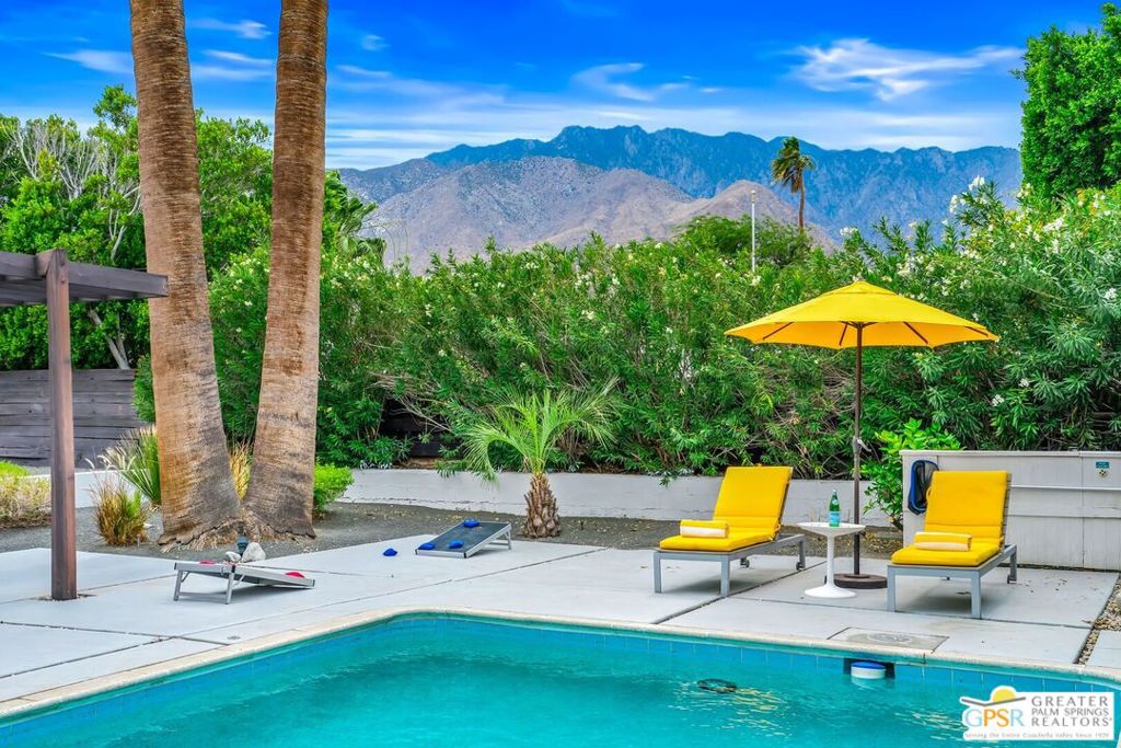 Long-term lease only. Looking for a Mid-century home yet not ready to buy? Elevate your lifestyle with this 1959 mid-century Palm Springs home, originally designed by renowned architect, William Krisel. The signature "butterfly" roof immediately sets the tone for true Palm Springs living at it's best! Blending vintage charm with modern convenience, the bright open floor plan features sleek concrete floors and mid-century modern decor. Lounge in the stylish living area, curl up by the fireplace, or enjoy a favorite film on the cozy sofa. The retro-chic kitchen embraces its authentic 1950s cabinetry, complemented by top-tier stainless steel appliances - whether you're crafting a gourmet meal or whipping up a midnight snack, you'll enjoy doing it in style. With three bedrooms, you'll have space for guest and/or a home office. The primary bedroom has an en-suite bathroom renovated with a shower over a tub and has direct access to the private yard. Both guest rooms enjoy clerestory windows, high ceilings and share the guest bathroom also with a shower-tub combo. Step into your private desert oasis, where sun-drenched relaxation meets stunning mountain views. Cool off in the expansive pool, unwind in the eight-person infinity spa, or soak up the rays on cushioned lounge chairs. Host an al fresco feast under the pergola-covered dining area while firing up the natural gas grill for effortless outdoor cooking. Nestled in Racquet Club Estates, a peaceful neighborhood just 1.5 miles from downtown, this home offers easy access to Palm Canyon Drive's buzzing restaurants, boutiques, and cultural hotspots. INCLUDED in RENT: Water, Trash, Landscaping and Pool Maintenance.