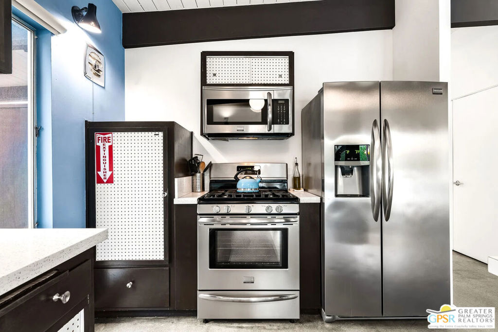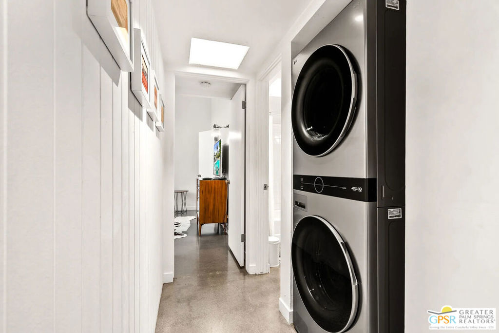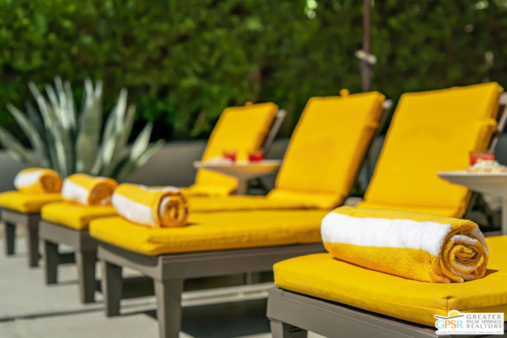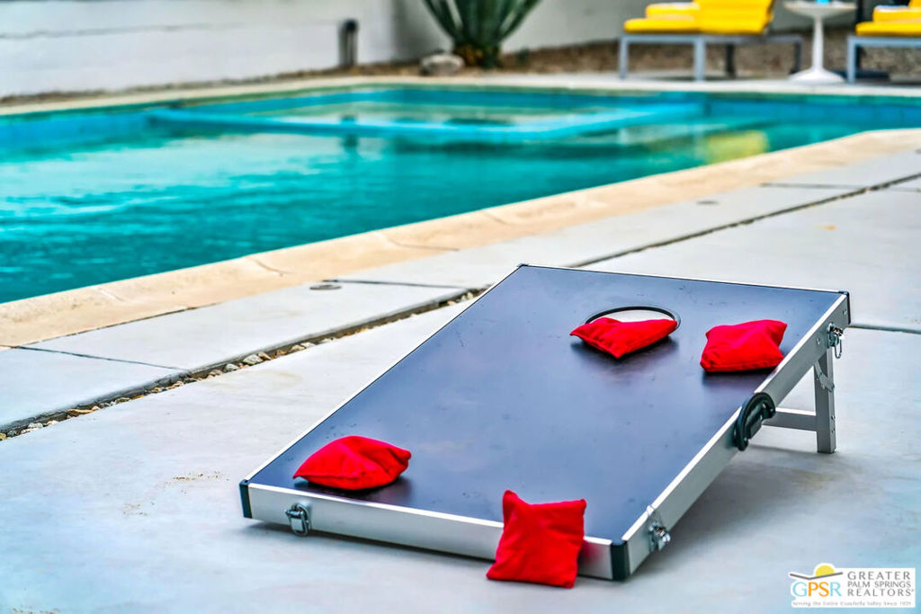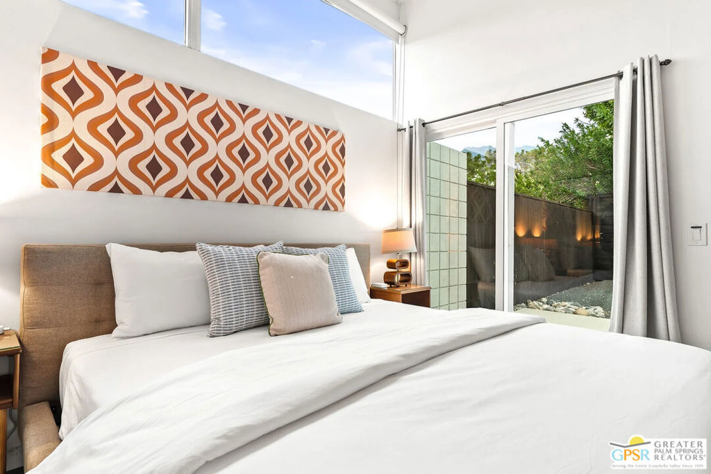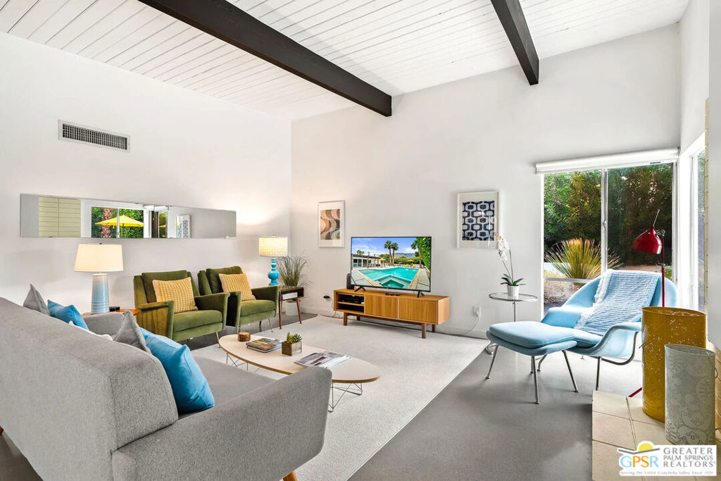 Long-term lease only. Looking for a Mid-century home yet not ready to buy? Elevate your lifestyle with this 1959 mid-century Palm Springs home, originally designed by renowned architect, William Krisel. The signature "butterfly" roof immediately sets the tone for true Palm Springs living at it's best! Blending vintage charm with modern convenience, the bright open floor plan features sleek concrete floors and mid-century modern decor. Lounge in the stylish living area, curl up by the fireplace, or enjoy a favorite film on the cozy sofa. The retro-chic kitchen embraces its authentic 1950s cabinetry, complemented by top-tier stainless steel appliances - whether you're crafting a gourmet meal or whipping up a midnight snack, you'll enjoy doing it in style. With three bedrooms, you'll have space for guest and/or a home office. The primary bedroom has an en-suite bathroom renovated with a shower over a tub and has direct access to the private yard. Both guest rooms enjoy clerestory windows, high ceilings and share the guest bathroom also with a shower-tub combo. Step into your private desert oasis, where sun-drenched relaxation meets stunning mountain views. Cool off in the expansive pool, unwind in the eight-person infinity spa, or soak up the rays on cushioned lounge chairs. Host an al fresco feast under the pergola-covered dining area while firing up the natural gas grill for effortless outdoor cooking. Nestled in Racquet Club Estates, a peaceful neighborhood just 1.5 miles from downtown, this home offers easy access to Palm Canyon Drive's buzzing restaurants, boutiques, and cultural hotspots. INCLUDED in RENT: Water, Trash, Landscaping and Pool Maintenance.