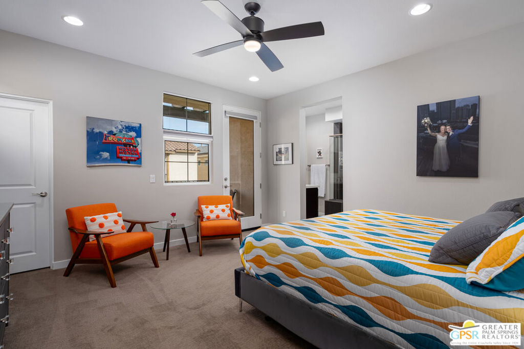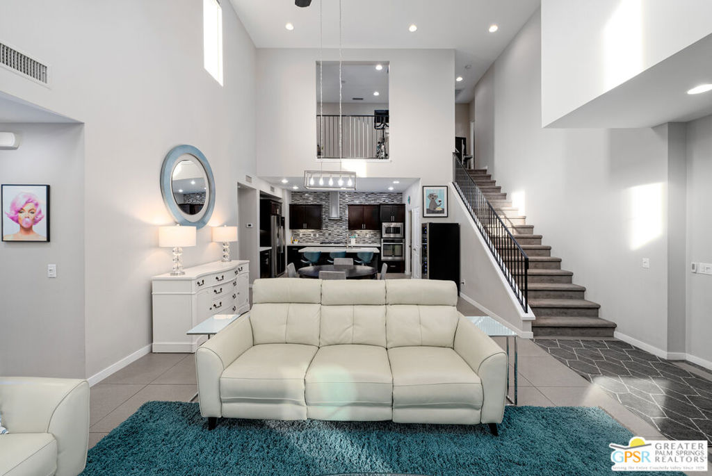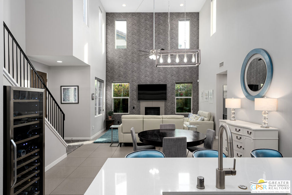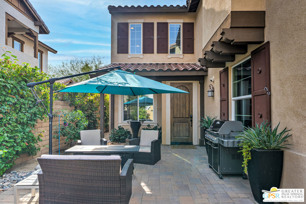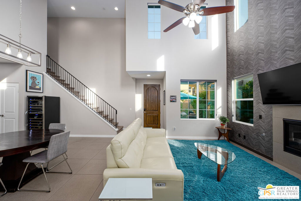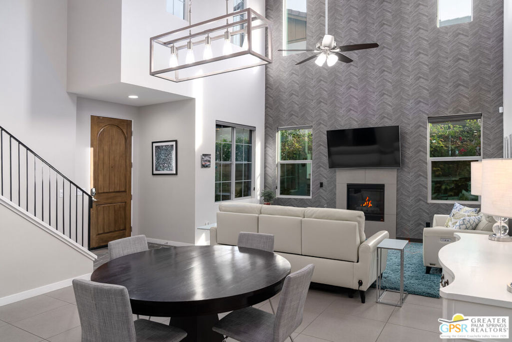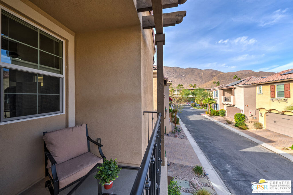 Looking for a home with low maintenance, a community gym and close to stores and restaurants? Furnished per Inventory. Close to EVERYTHING downtown Palm Springs has to offer. This meticulously styled home offers almost 2,000 square feet of living space with three bedrooms and three bathrooms. In the gated community of Village Traditions, this home is exceptionally located close to downtown Palm Springs. Setting the tone immediately for private outdoor living, the spacious courtyard welcomes your guests to your home, and invites your morning coffee or evening downtime. Upon entering the home, the great room provides soaring ceilings, a central living room gas fireplace and is bathed in natural light. Enjoy the large kitchen island with central sink and bar seating allows the perfect flexibility from casual coffee to advanced food prep or party food & beverage setup. Other features include stainless steel appliances, gas cooktop, quartz countertops and full wall backsplash tile. On the ground floor, the primary suite offers a large walk-in closet, dual-sink vanities, a built-in tub and beautifully tiled glass shower. Also downstairs, the third bedroom has direct access to a full bathroom. Upstairs, and overlooking the great room, the spacious loft allows for flexible living as either a work-out space, or small office. The secondary main suite includes a walk-in closet, private balcony with mountain views and en-suite bathroom with quartz countertops, dual vanity sinks and generous walk-in shower with seating. Additionally, the surrounding block wall provides an enclosed, private and safe wrap-around dog run. Private attached two car garage with storage room and separate laundry room/pantry just off the kitchen. Community features include gated access, fitness center, pool, spa, outdoor BBQ grills, seating, outdoor shower and restrooms. The fitness center includes free weights, treadmills, spin bike and various training machines & racks. Front landscaping maintenance and 1GB Frontier Internet is covered by HOA. Enjoy living blocks from downtown Palm Springs close to Melvyn's, Johnny Costas, the Historic Tennis Club, and the Lykken Trail. VIDEO: https://youtu.be/KQaHC8hWDq