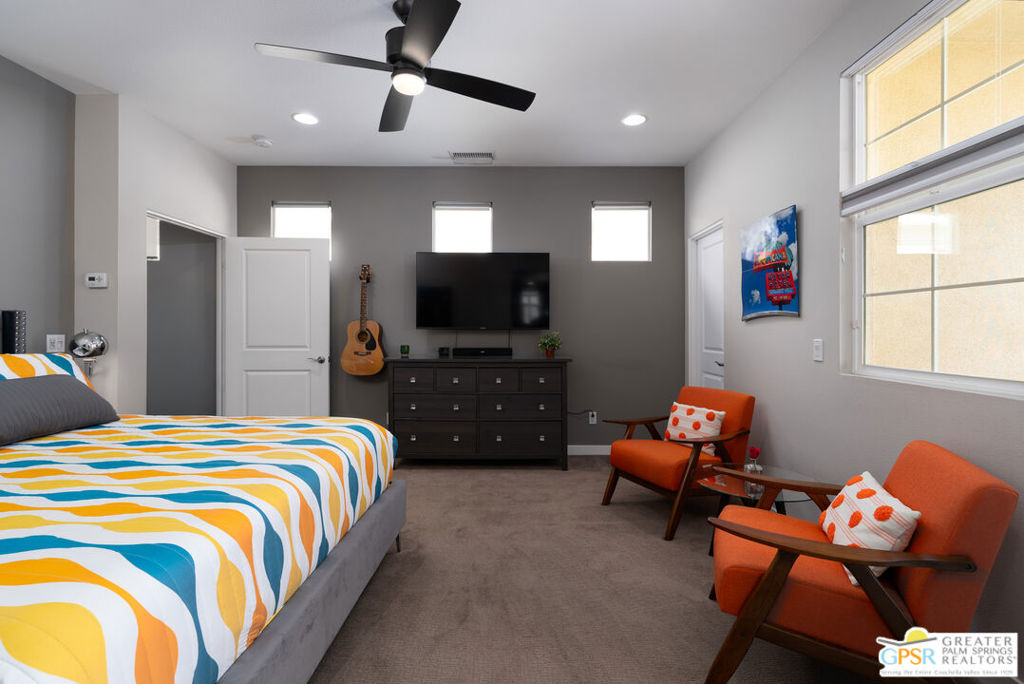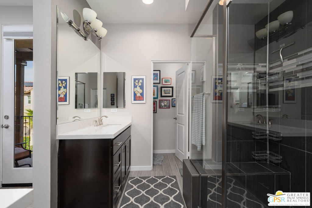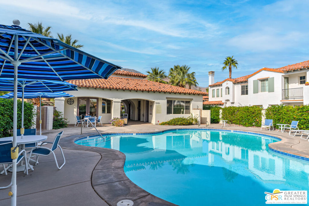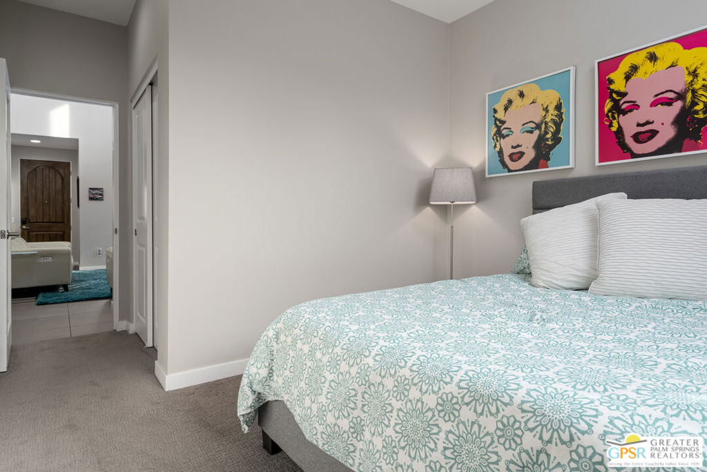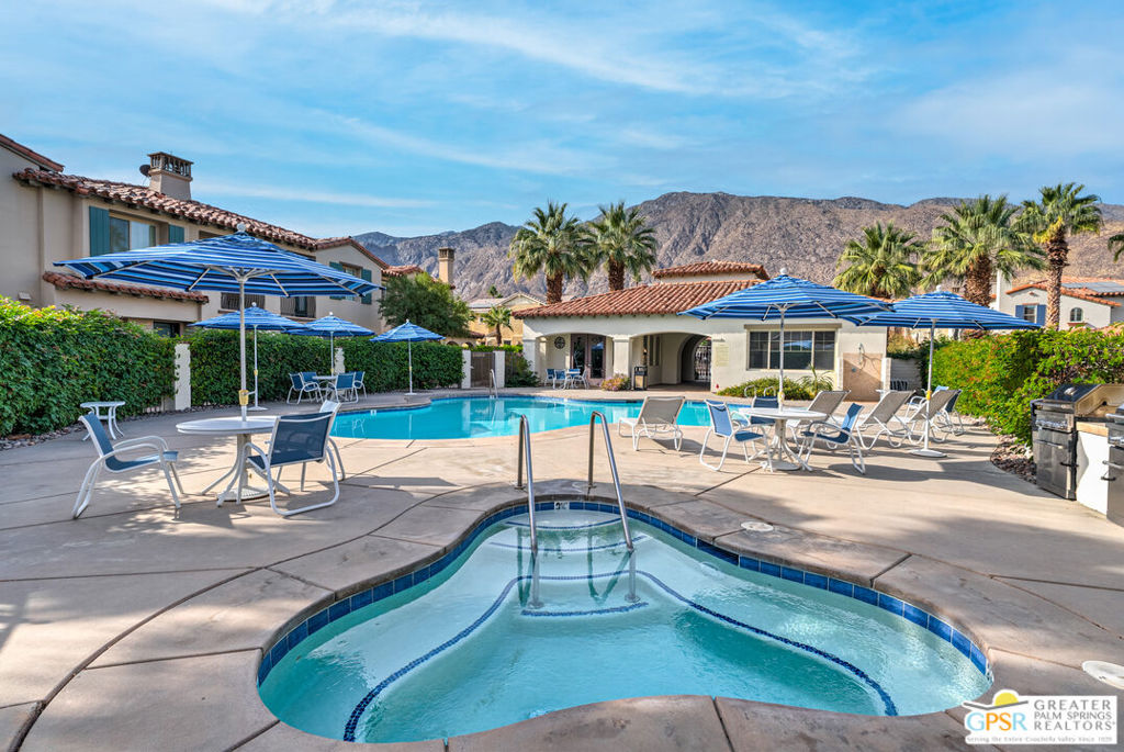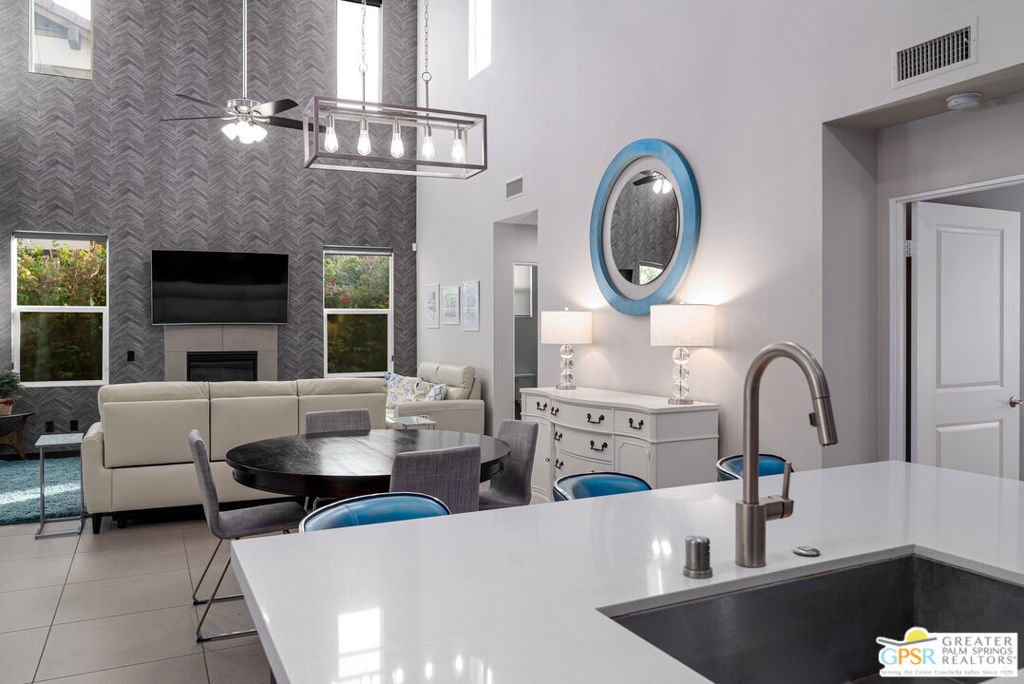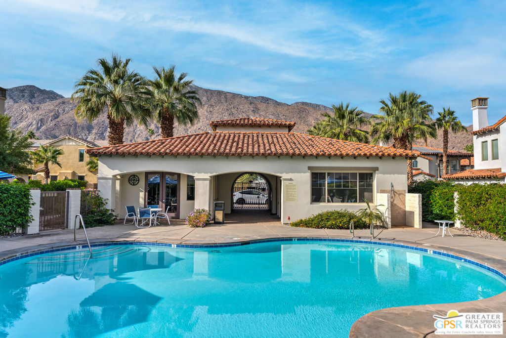 Looking for a home with low maintenance, a community gym and close to stores and restaurants? Furnished per Inventory. Close to EVERYTHING downtown Palm Springs has to offer. This meticulously styled home offers almost 2,000 square feet of living space with three bedrooms and three bathrooms. In the gated community of Village Traditions, this home is exceptionally located close to downtown Palm Springs. Setting the tone immediately for private outdoor living, the spacious courtyard welcomes your guests to your home, and invites your morning coffee or evening downtime. Upon entering the home, the great room provides soaring ceilings, a central living room gas fireplace and is bathed in natural light. Enjoy the large kitchen island with central sink and bar seating allows the perfect flexibility from casual coffee to advanced food prep or party food & beverage setup. Other features include stainless steel appliances, gas cooktop, quartz countertops and full wall backsplash tile. On the ground floor, the primary suite offers a large walk-in closet, dual-sink vanities, a built-in tub and beautifully tiled glass shower. Also downstairs, the third bedroom has direct access to a full bathroom. Upstairs, and overlooking the great room, the spacious loft allows for flexible living as either a work-out space, or small office. The secondary main suite includes a walk-in closet, private balcony with mountain views and en-suite bathroom with quartz countertops, dual vanity sinks and generous walk-in shower with seating. Additionally, the surrounding block wall provides an enclosed, private and safe wrap-around dog run. Private attached two car garage with storage room and separate laundry room/pantry just off the kitchen. Community features include gated access, fitness center, pool, spa, outdoor BBQ grills, seating, outdoor shower and restrooms. The fitness center includes free weights, treadmills, spin bike and various training machines & racks. Front landscaping maintenance and 1GB Frontier Internet is covered by HOA. Enjoy living blocks from downtown Palm Springs close to Melvyn's, Johnny Costas, the Historic Tennis Club, and the Lykken Trail. VIDEO: https://youtu.be/KQaHC8hWDq