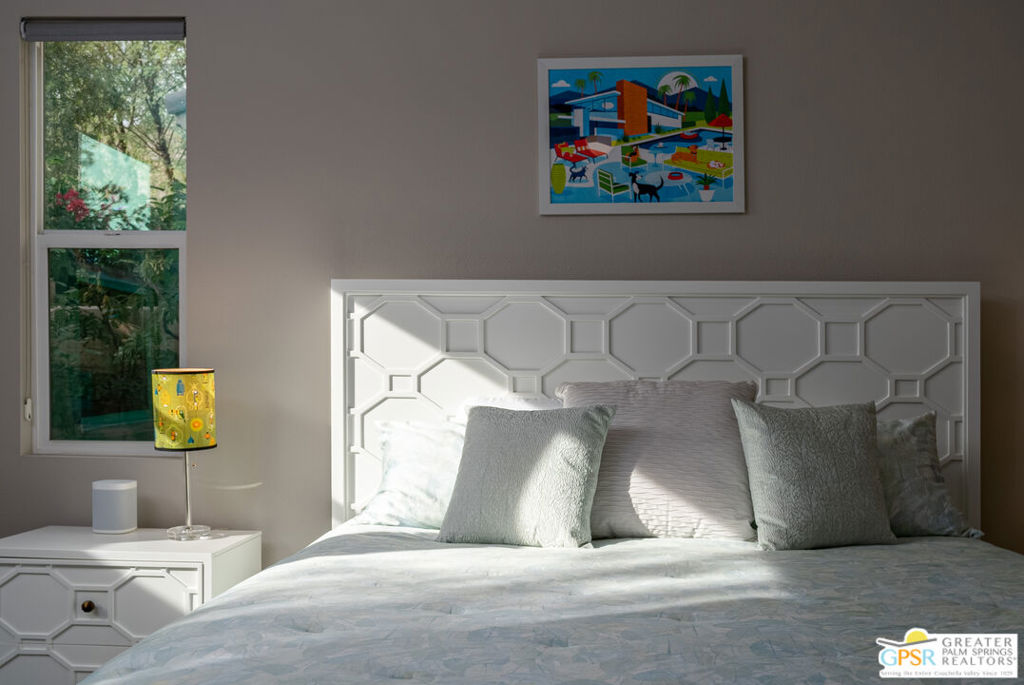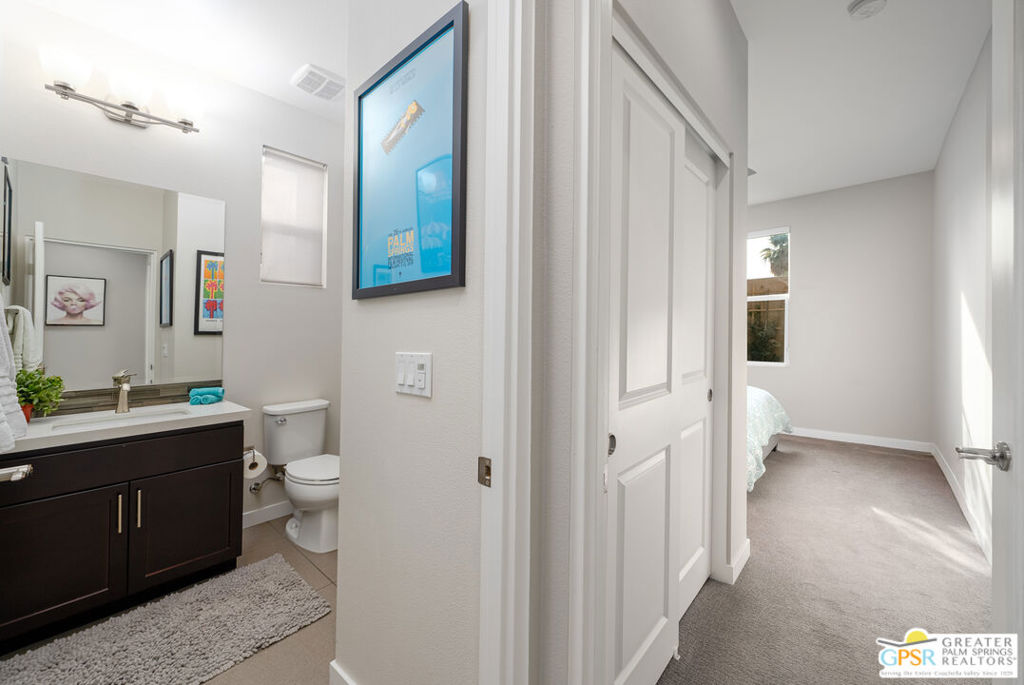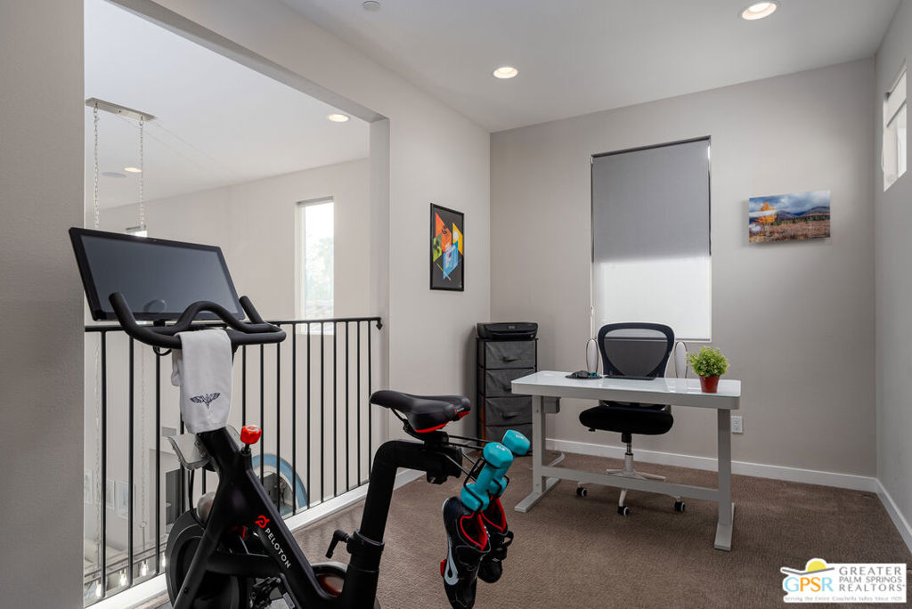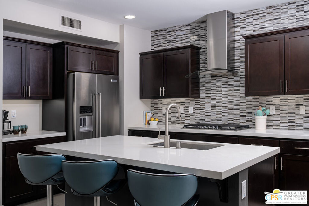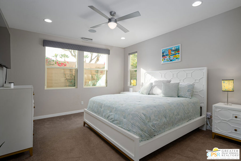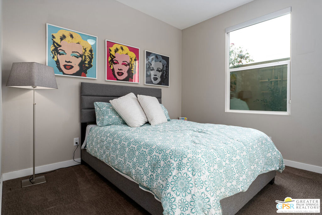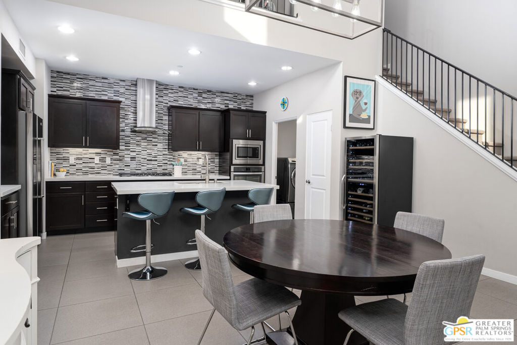 Looking for a home with low maintenance, a community gym and close to stores and restaurants? Furnished per Inventory. Close to EVERYTHING downtown Palm Springs has to offer. This meticulously styled home offers almost 2,000 square feet of living space with three bedrooms and three bathrooms. In the gated community of Village Traditions, this home is exceptionally located close to downtown Palm Springs. Setting the tone immediately for private outdoor living, the spacious courtyard welcomes your guests to your home, and invites your morning coffee or evening downtime. Upon entering the home, the great room provides soaring ceilings, a central living room gas fireplace and is bathed in natural light. Enjoy the large kitchen island with central sink and bar seating allows the perfect flexibility from casual coffee to advanced food prep or party food & beverage setup. Other features include stainless steel appliances, gas cooktop, quartz countertops and full wall backsplash tile. On the ground floor, the primary suite offers a large walk-in closet, dual-sink vanities, a built-in tub and beautifully tiled glass shower. Also downstairs, the third bedroom has direct access to a full bathroom. Upstairs, and overlooking the great room, the spacious loft allows for flexible living as either a work-out space, or small office. The secondary main suite includes a walk-in closet, private balcony with mountain views and en-suite bathroom with quartz countertops, dual vanity sinks and generous walk-in shower with seating. Additionally, the surrounding block wall provides an enclosed, private and safe wrap-around dog run. Private attached two car garage with storage room and separate laundry room/pantry just off the kitchen. Community features include gated access, fitness center, pool, spa, outdoor BBQ grills, seating, outdoor shower and restrooms. The fitness center includes free weights, treadmills, spin bike and various training machines & racks. Front landscaping maintenance and 1GB Frontier Internet is covered by HOA. Enjoy living blocks from downtown Palm Springs close to Melvyn's, Johnny Costas, the Historic Tennis Club, and the Lykken Trail. VIDEO: https://youtu.be/KQaHC8hWDq