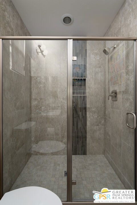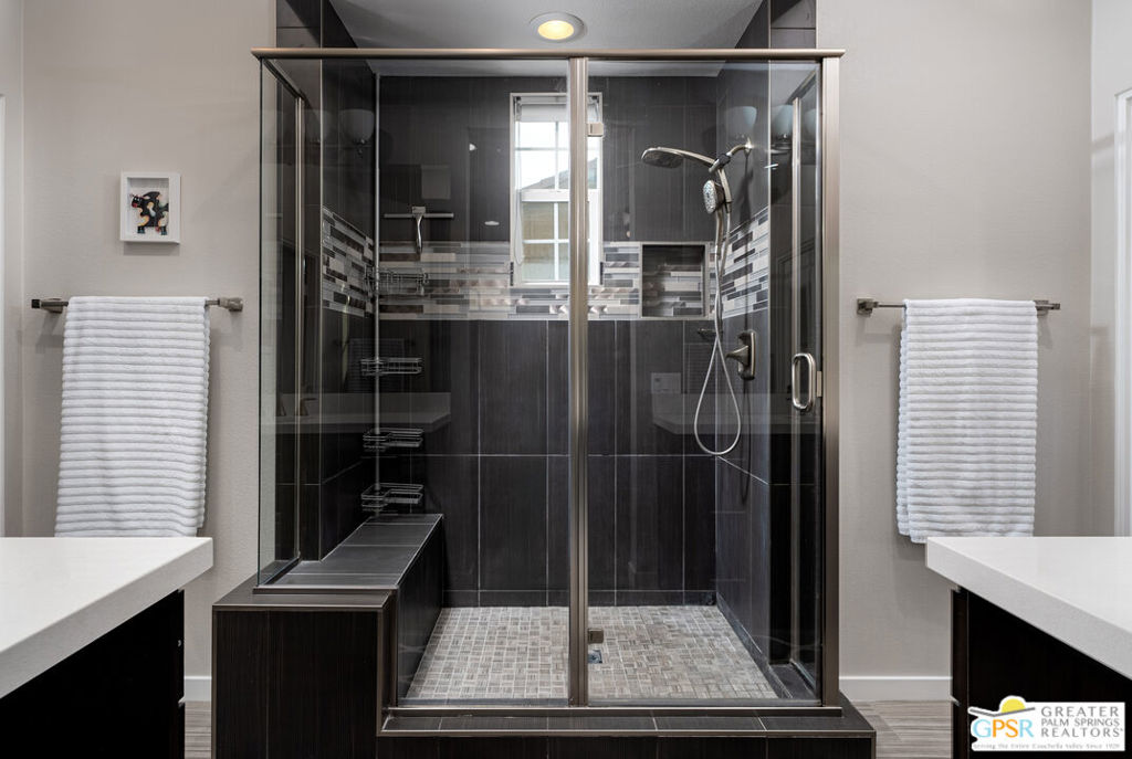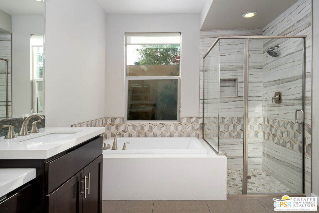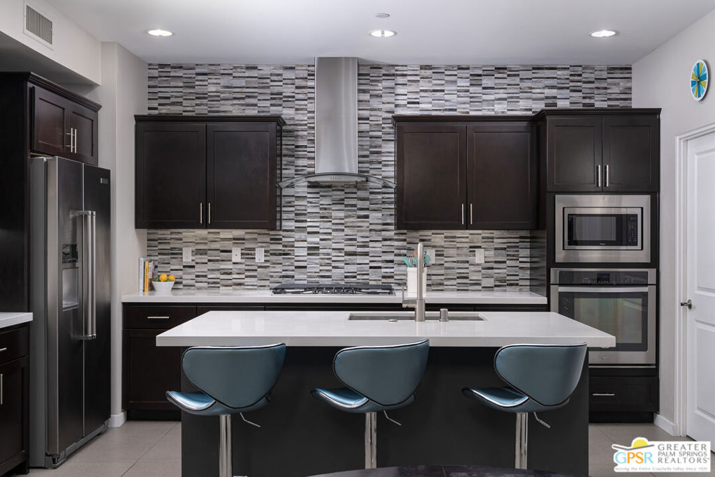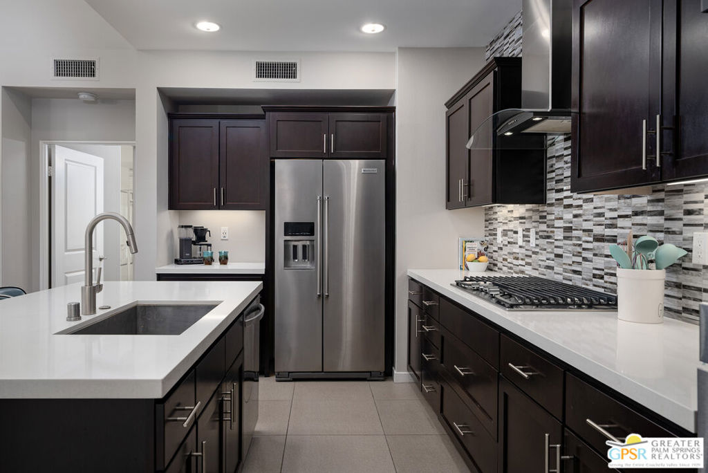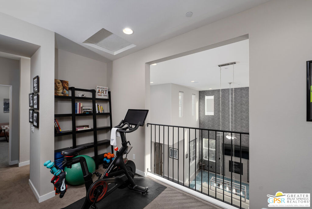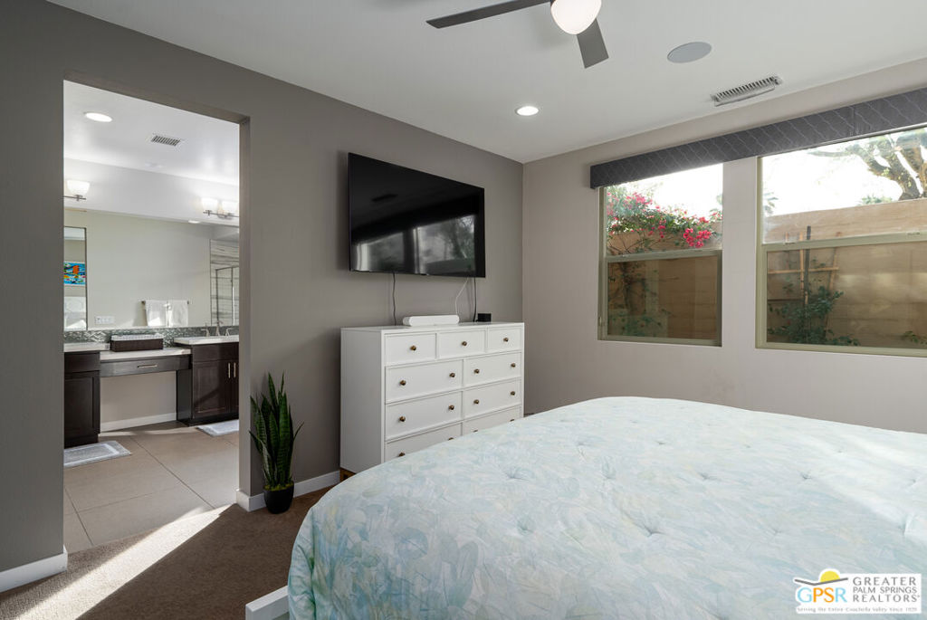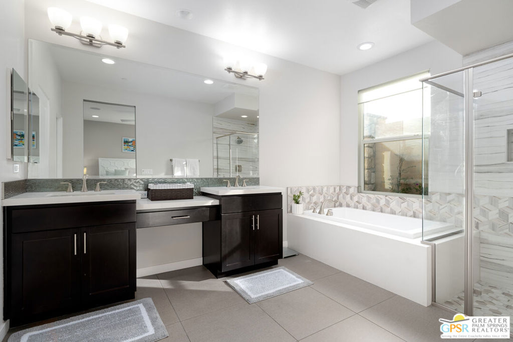 Looking for a home with low maintenance, a community gym and close to stores and restaurants? Furnished per Inventory. Close to EVERYTHING downtown Palm Springs has to offer. This meticulously styled home offers almost 2,000 square feet of living space with three bedrooms and three bathrooms. In the gated community of Village Traditions, this home is exceptionally located close to downtown Palm Springs. Setting the tone immediately for private outdoor living, the spacious courtyard welcomes your guests to your home, and invites your morning coffee or evening downtime. Upon entering the home, the great room provides soaring ceilings, a central living room gas fireplace and is bathed in natural light. Enjoy the large kitchen island with central sink and bar seating allows the perfect flexibility from casual coffee to advanced food prep or party food & beverage setup. Other features include stainless steel appliances, gas cooktop, quartz countertops and full wall backsplash tile. On the ground floor, the primary suite offers a large walk-in closet, dual-sink vanities, a built-in tub and beautifully tiled glass shower. Also downstairs, the third bedroom has direct access to a full bathroom. Upstairs, and overlooking the great room, the spacious loft allows for flexible living as either a work-out space, or small office. The secondary main suite includes a walk-in closet, private balcony with mountain views and en-suite bathroom with quartz countertops, dual vanity sinks and generous walk-in shower with seating. Additionally, the surrounding block wall provides an enclosed, private and safe wrap-around dog run. Private attached two car garage with storage room and separate laundry room/pantry just off the kitchen. Community features include gated access, fitness center, pool, spa, outdoor BBQ grills, seating, outdoor shower and restrooms. The fitness center includes free weights, treadmills, spin bike and various training machines & racks. Front landscaping maintenance and 1GB Frontier Internet is covered by HOA. Enjoy living blocks from downtown Palm Springs close to Melvyn's, Johnny Costas, the Historic Tennis Club, and the Lykken Trail. VIDEO: https://youtu.be/KQaHC8hWDq