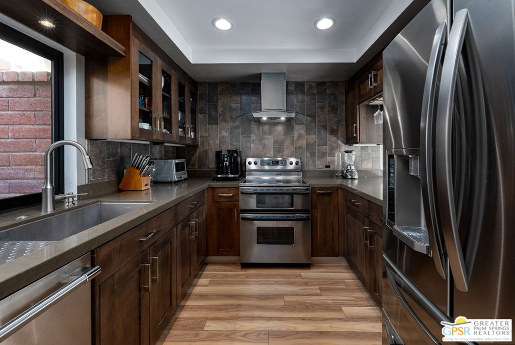 Located in the desirable community of Canyon Sands, this single-level condo features 2 bedrooms and 2 bathrooms with a large private patio with retractable awning that expands your living space to both indoors and outdoors. This condo only has one common wall and that's in the garage. The main living area features tall cathedral beamed ceiling, dual-pane sliders and brick gas fireplace. Spanning the entre back wall, the sliders allow natural light throughout the room and access to the expansive private patio. The renovated kitchen has been updated with stainless steel appliances, quartz countertops, modern cabinetry. The primary bedroom includes a large en-suite bathroom with walk-in shower and walk-in closet. The guest bedroom is down the hall with nice separate of space, and an adjacent bathroom with shower and tub. The two-car attached garage is insulated against the elements and includes full-size washer and dryer, built-in storage cabinets, tankless water heater and an EV CAR CHARGER. HOA dues include water/sewer, trash removal, cable TV and Internet Service, exterior building maintenance (including roof) and earthquake insurance. The reasonable land lease extends through 2061, and 30-day minimum rentals are allowed. As a resident of Canyon Sands, you will enjoy professional on-site management, 7 pools and spas, 2 saunas and 5 championship tennis courts and 3 pickleball courts, all within a beautiful setting and community.