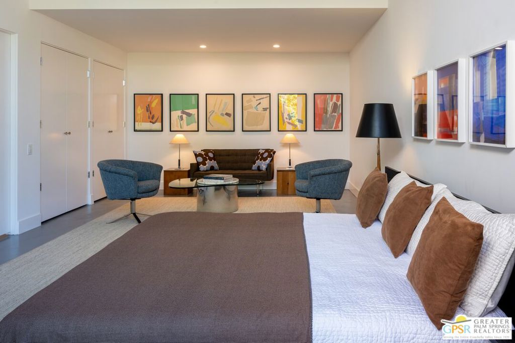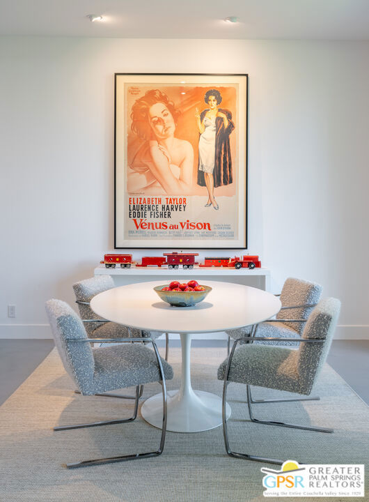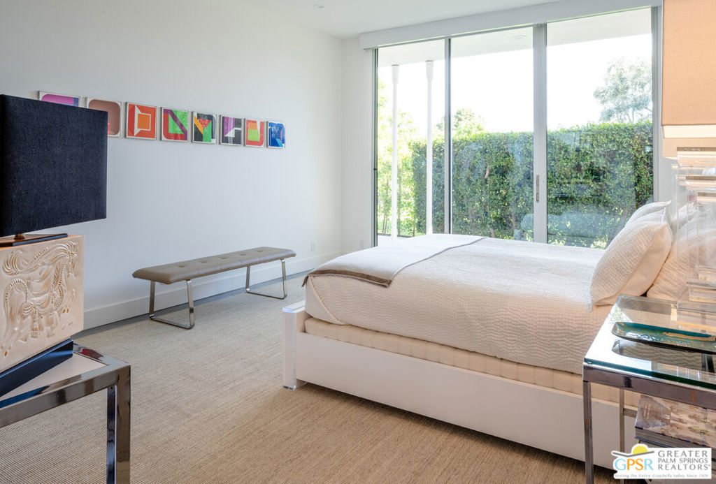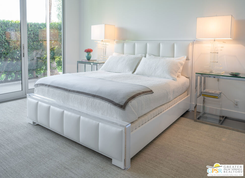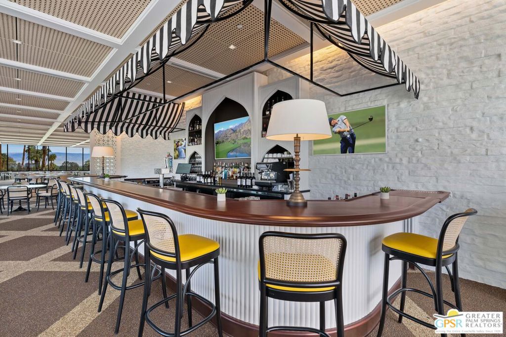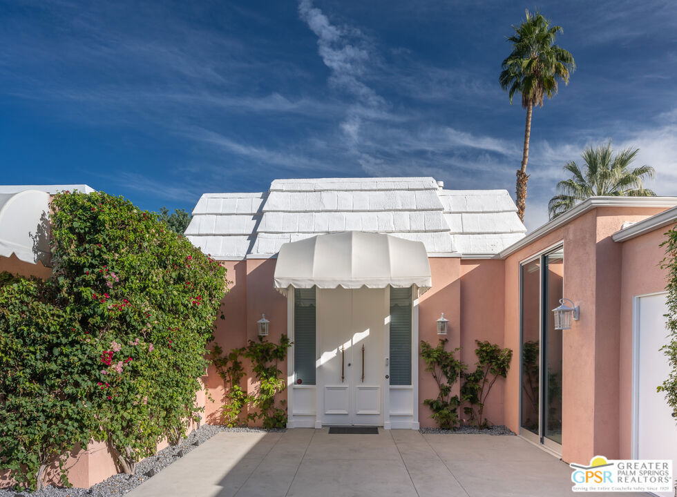 Situated in prestigious Marrakesh Country Club, this John Elgin Woolf designed Hollywood Regency Villa is a pinnacle of modern luxury. Remodeled by renowned celebrity photographer, Firooz Zahedi, author of several books including "My Elizabeth" on Elizabeth Taylor. This three-bedroom, three-bathroom, 2,427 square foot home is the largest of the original floor plans with the remodel completed in October 2025. Enter through the west-facing courtyard beautified with new hardscape and soft, lush landscaping scaling the exterior walls. Through iconic Marrakesh double doors lies a stunning, high-end modern renovation representative of a caliber that is higher than standard. The tall ceilings, extremely smooth white walls, new modern sliders and modern shades enhance light and set the mood throughout the home. In the living room, the black marbled fireplace, recessed art lighting and electric dual sun/blackout shades allow for the manipulation of light to your choice of ambience. Large new sliders frame stunning mountain views and the enormous green space behind. The expanded kitchen footprint allows for modern living with stainless steel appliances, gas cooking, modern gloss cabinetry, wine refrigerator and ample counter space. All bedrooms have private, en-suite baths with Restoration Hardware vanities in all baths. The primary bedroom includes a spacious bathroom with standalone tub, separate marble shower, new vanities, plumbing and fixtures. The walk-in closet includes custom shelving and organizers, and built-in laundry basket and wall storage. The secondary bedroom suite have been expanded to include a separate seating or office area, built-in closets and en-suite bathroom with shower. The third bedroom also includes an en-suite bathroom with shower and access to the front courtyard. Stackable laundry is hidden with convenient shelving and separate wash basin. Additional features include: a tankless water heater, two newly installed HVAC systems, two-car garage with EV Charging port, new electrical subpanel, new sliders/windows and a 38 panel/11.21kW solar system. Marrakesh is a boutique country club with an ideal central valley location amongst a few of the desert's finest private clubs. Amenities include 18-hole private executive golf course, tennis, pickleball, 14 pools and spa, a fitness center, and an active and newly-remodeled clubhouse with fine dining. Marrakesh is near famous El Paseo with all of its elegant boutiques, restaurants, art galleries, and coffee houses. Come experience Marrakesh Country Club. Furniture and Art available outside of escrow separate from the listing price.